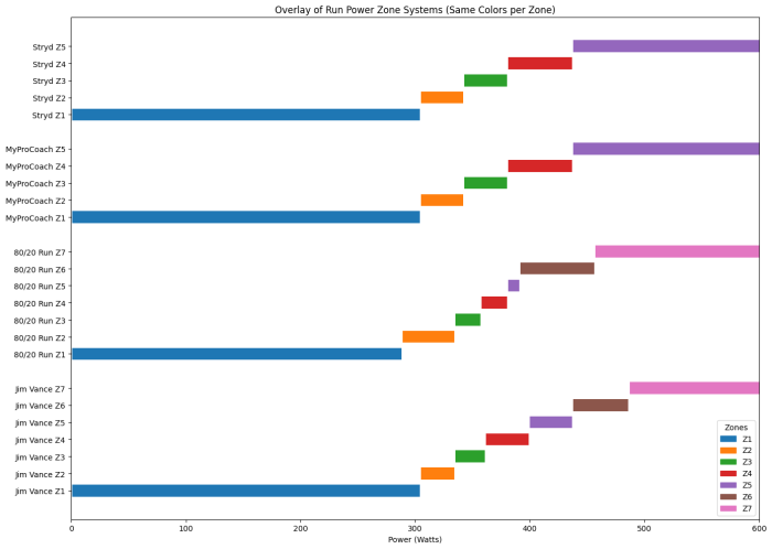 The power zones for cycling are less suited for running — for example, for a Z2 HR run, a corresponding cycling power zone is likely to be biased upwards. Physiological differences between cycling and running play an important role.
